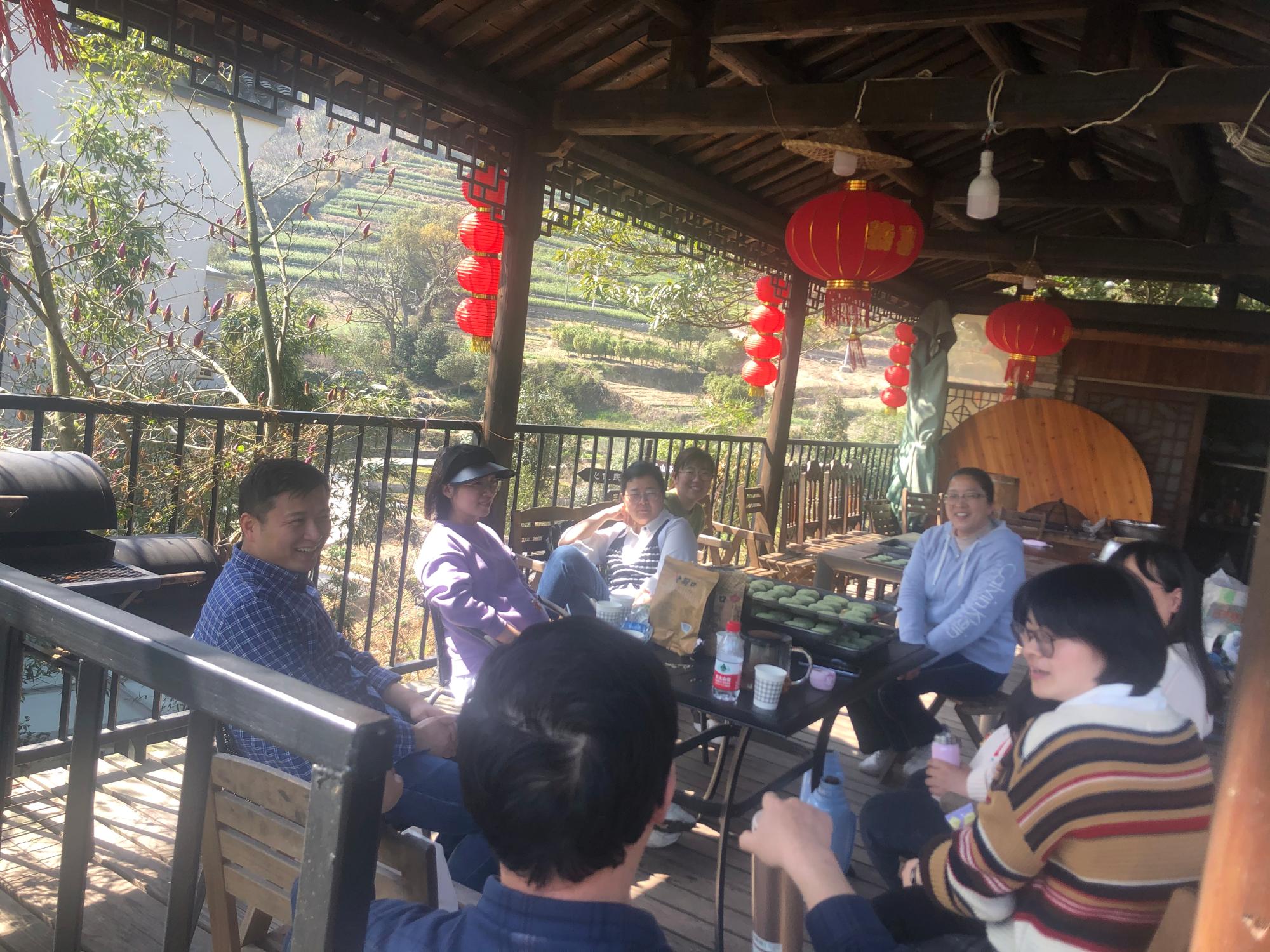 我们的第一站是北仑白峰虾腊,虾腊是个背山面海、风景秀丽的小村庄,这里既有清山的秀美,也有大海的壮阔。一条溪坑把虾腊村分为东西两部分,沿着溪流上溯源头,便可见两座水库建于大山环绕之中,山的倒影将水染得碧绿。沿着水库边缘的小路上山,就直达久负盛名的“龙头”,在这里,还能看到有宁波“小九寨”之称的龙潭。一路上老师们说说笑笑,很是惬意,被优美僻静的风景所吸引。下山后,来到心仪民宿,采茶喝茶、制作手工青团、凉亭畅聊,老师们对丰富多彩的活动赞不绝口,希望能够多组织类似的活动,增强教职工的凝聚力,丰富业余生活,提高幸福指数。